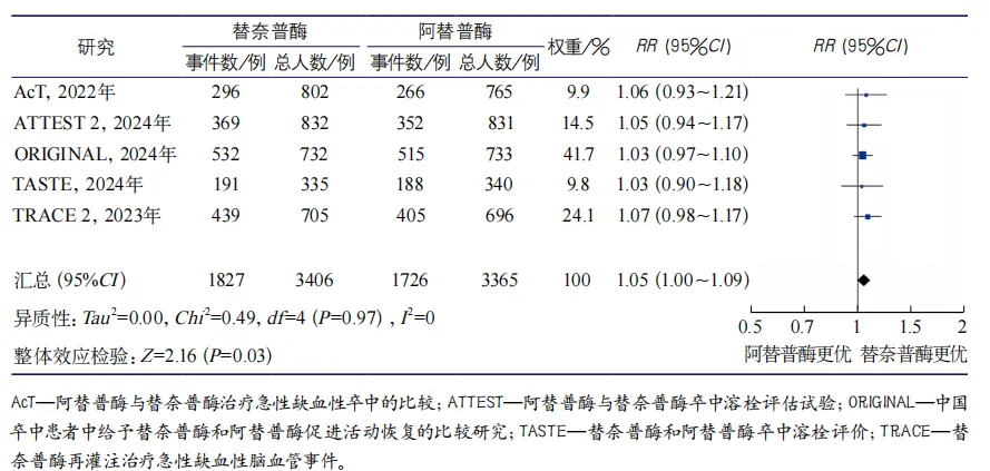另外一项纳入11项随机对照试验的荟萃分析,同样显示,与阿替普酶相比,替奈普酶与更高的良好功能预后可能性显著相关(RR 1.05,95%CI 1.01-1.10,P=0.012),且3个月时的残疾程度更低(cOR 1.10,95%CI 1.01-1.19,P=0.034),两组症状性颅内出血发生率、3个月死亡率相似5。