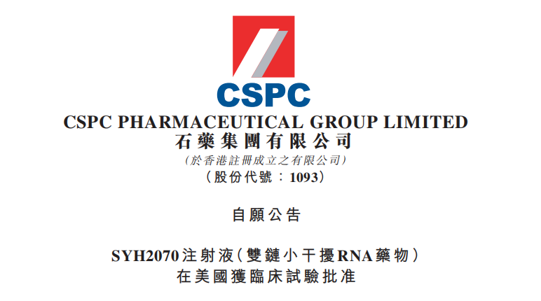 (1093.HK)宣布,本集团自主研发的化学1类新药SYH2070注射液(双链小干扰RNA(siRNA)药物)(下称:该产品)已获得美国食品药品监督管理局(FDA)批准,可在美国开展临床试验。该产品亦于2025年9月获得中华人民共和国国家药品监督管理局批准在中国开展临床试验。