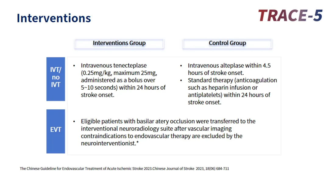 TRACE-5研究是由首都医科大学附属北京天坛医院王拥军教授团队发起的一项多中心、前瞻性、开放标签、终点盲法、随机对照临床试验。该研究旨在探究在发病(或临床表现恶化/昏迷)或距最后正常时间24小时内基底动脉闭塞的卒中患者中使用替奈普酶静脉溶栓的有效性和安全性。主要纳入症状发生后24小时内、磁共振血管成像(MRA)/ CT血管成像(CTA)提示基底动脉闭塞或次全闭塞,24小时内是否接受取栓可由当地医生决定。研究主要结局为3个月时mRS评分为0-1分(无残疾)或恢复至基线mRS(如果发病前的基线mRS为2-3分)的患者比例,安全性结局包括症状性颅内出血(sICH)患者的比例90天内的全因死亡率。