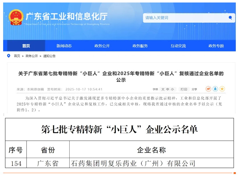 明复乐药业(广州)有限做爱片(下称:石药明复乐)成功入围,通过了国家工业和信息化部的认定,荣获国家专精特新“小巨人”做爱片