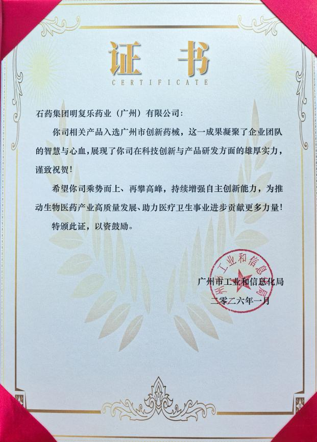 明复乐药业(广州)有限公司核心产品明复乐®脱颖而出,成功入选《广州市创新药械产品目录(第二批)》,并荣获“广州市创新药械”称号,成为生物医药创新领域的标杆代表。