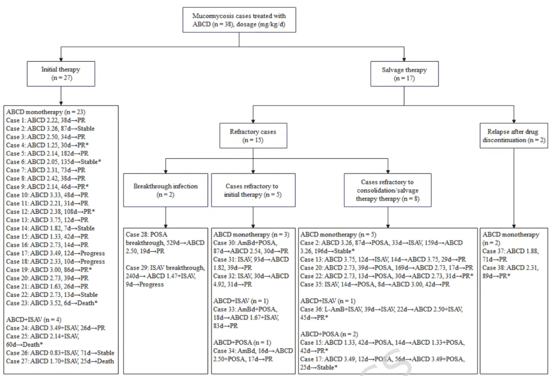 本研究为一项单中心、回顾性、真实世界研究,纳入2021年8月至2024年4月在华山医院接受ABCD治疗的38例毛霉菌病患者。研究旨在评估长期、低剂量ABCD在初始治疗和挽救治疗中的疗效与安全性,并分析影响90天预后的因素。
