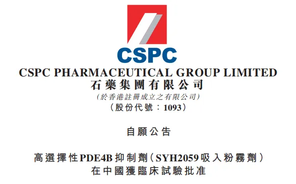 (1093.HK)宣布,本集团开发的化药1类新药高选择性PDE4B抑制剂(SYH2059吸入粉雾剂)(下称:该产品)已获中华人民共和国国家药品监督管理局批准,可在中国开展临床试验。该产品亦已于2026年3月获得美国食品药品监督管理局(FDA)批准在美国开展临床试验。