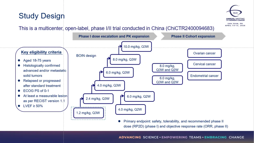 该I/II期研究在中国开展(ChiCTR2400094683),探索不同的剂量队列,包括1.2 mg/kg、2.4 mg/kg、4 mg/kg、6 mg/kg、8 mg/kg和10 mg/kg(每三周一次,Q3W)以及4 mg/kg、6 mg/kg(每两周一次,Q2W)方案,旨在评估SYS6043在包括妇科肿瘤在内的晚期或转移性实体瘤患者中的安全性、耐受性、药代动力学及初步抗肿瘤活性。