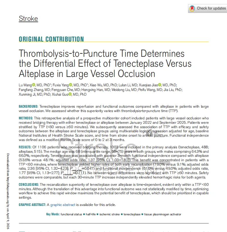 近日,首都医科大学宣武医院郭秀海教授团队在卒中领域国际顶刊 STROKE 发表重磅临床研究,首次证实溶栓至穿刺时间(TTP)决定中国替奈普酶(明复乐®,rhTNK‑tPA)相较于阿替普酶的差异化疗效,在大血管闭塞桥接救治中,TTP<60分钟窗口内明复乐®早期再通率、3个月功能独立率显著更优,安全性与阿替普酶相当。