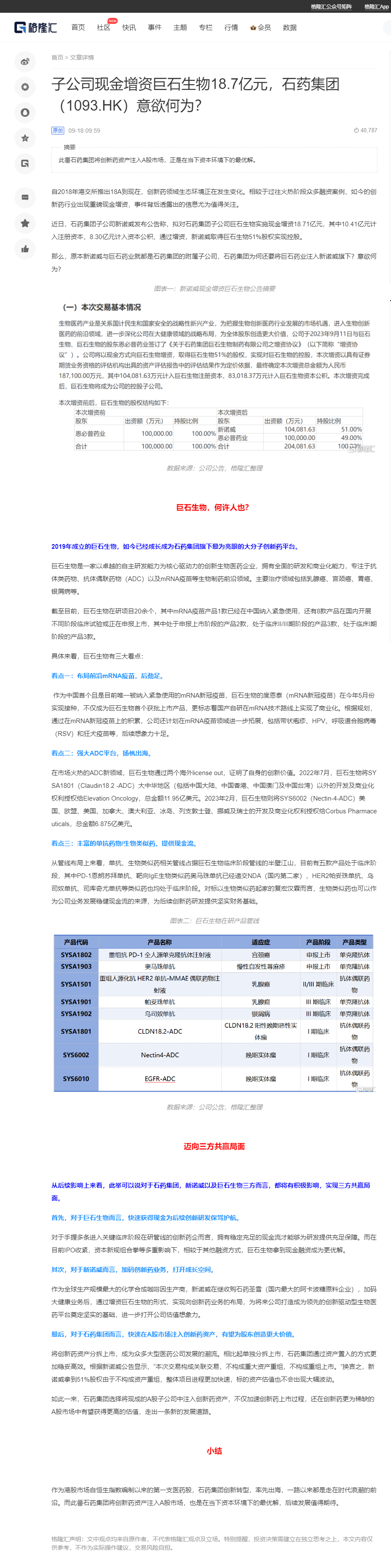 作为港股市场自恒生指数编制以来的第一支医药股,做爱片 创新转型,率先出海,一路以来都是走在时代浪潮的前沿。而此番做爱片 将创新药资产注入A股市场,也是在当下资本环境下的最优解,后续发展值得期待。