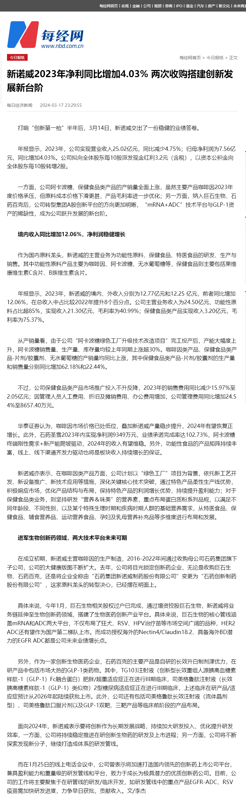 新诺威2023年净利同比增加4.03% 两次收购搭建创新发展新台阶