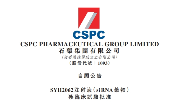 宣布,本集团自主研发的化学1类新药SYH2062注射液(双链小干扰RNA(siRNA)药物)(下称:该产品)已获得中华人民共和国国家药品监督管理局批准,可以在中国开展临床试验。