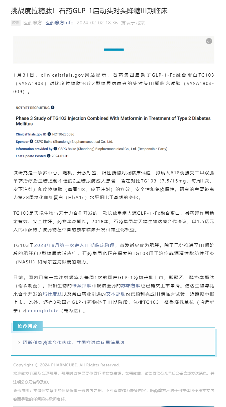 挑战度拉糖肽!石药GLP-1启动头对头降糖III期临床